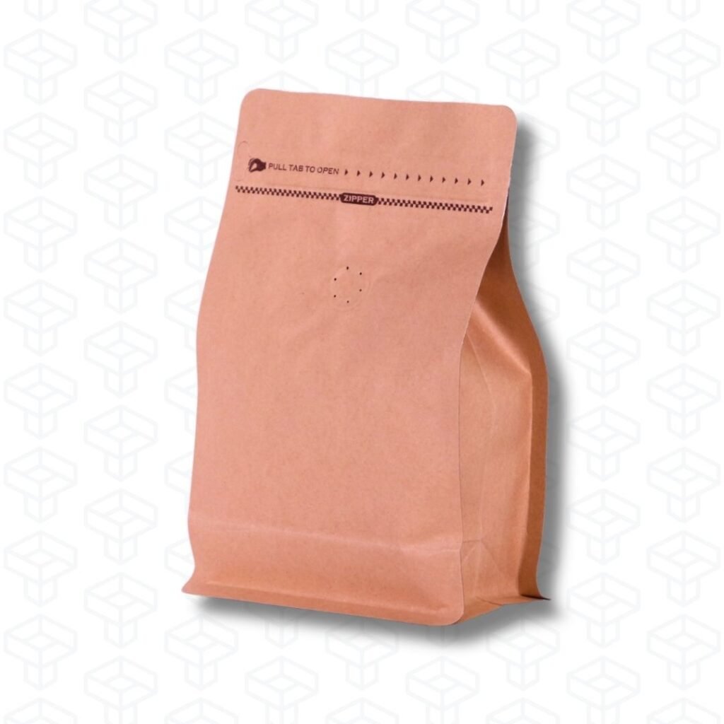 El Flat Bottom Pouch, también conocido como bolsa de fondo plano o tipo caja, es un formato más robusto y visualmente impactante. Tiene cinco caras imprimibles: frente, reverso, dos laterales y la base.